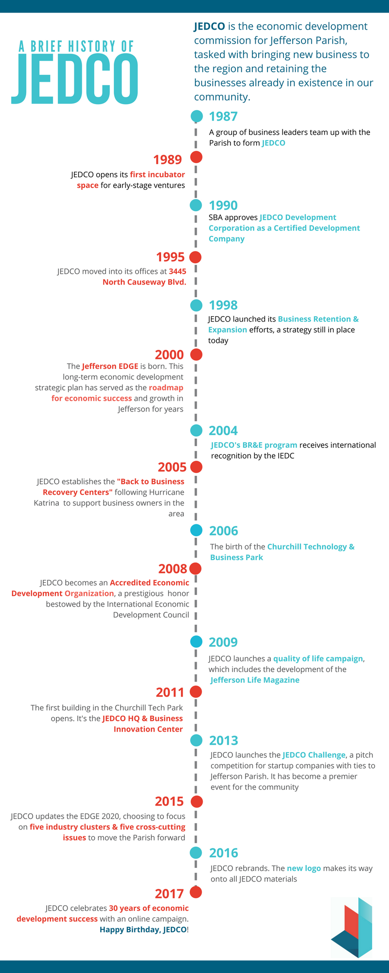For 30 years, JEDCO has played a vital role in the economic success of the Jefferson Parish business community. We are thrilled to celebrate 30 years of excellence and economic development wins. There have been many milestones along the way; moments in history that have helped shape who we are as an organization and a Parish. Below, you’ll see just a few of the ways in which JEDCO has grown and evolved over the last 30 years. Happy Birthday, JEDCO! #JEDCO30