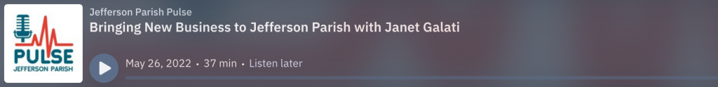 On this episode of the Jefferson Parish Pulse powered by JEDCO, we’re excited to introduce you to Janet Galati. Janet is JEDCO’s Director of Industry Recruitment, a newly-created position to help bring jobs and investment to Jefferson Parish. Janet started out as JEDCO’s Strategic Initiatives Specialist over 3.5 years ago and moved into this new role earlier this year. On the show, Janet talks about creating community champions to help Jefferson Parish’s story. She also dives deep into the many assets that make Jefferson Parish a global destination for business. Interested in locating to Jefferson Parish? Email Janet at jgalati@jedco.destinationbydesign.com.