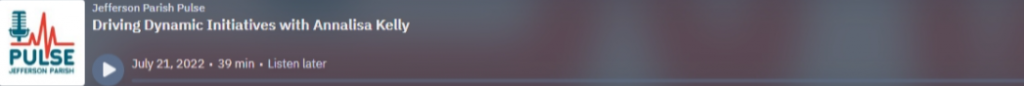 This week on the Jefferson Parish Pulse, we interviewed Annalisa Kelly, JEDCO Director of Strategic Initiatives and Policy. On any single day, Annalisa may be digging into a project that supports one of Jefferson Parish’s targeted industry clusters or focuses in on enhancing transit options for our workforce – and everything in between. Annalisa has hand in many projects – big developments, housing enhancements, new programs for the local seafood industry, transit, Brownfield assessment, and so much more. Annalisa shared some of the major projects she’s been working on in recent years and highlighted some of her favorite projects.