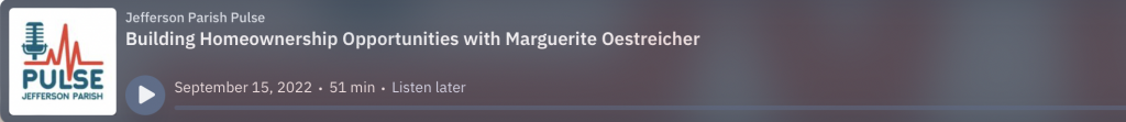 On this episode of the Jefferson Parish Pulse powered by JEDCO, we feature an interview with Marguerite Oestreicher, Executive Director of the New Orleans Area Habitat for Humanity. Margurite and her team are driving new and impactful projects across Jefferson Parish. Habitat for Humanity, with support from its many partners, volunteers and donors, is helping to improve housing stock in the area and creating opportunities to make dreams of safe, affordable home ownership possible for more of our residents.