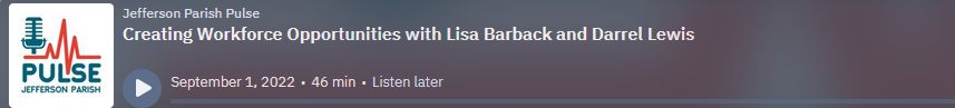 This week on the Jefferson Parish Pulse powered by JEDCO, we interviewed Lisa Barback, Vice Chair of the Jefferson Parish Workforce Development Board, and Darrel Lewis, the One Stop Operator for Jefferson Parish. They talked about the important work being driven by the Workforce Development Board and highlighted the many ways they are serving both job seekers and employers through their vast array of programs. They talked about their employee training programs, access to funding to support job opportunities, and what to expect at the newly reopened Jefferson Parish American Job Center at the Delgado River City Campus.