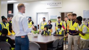 On Thursday and Friday, fifty selected eleventh graders from Fisher Middle-High School, L.W. Higgins High School, and West Jefferson High School toured four local manufacturing facilities. During these tours, the juniors connected with manufacturing professionals and were introduced to a variety of industry options and career pathways. Participating manufacturers included Carpenter and Patterson, Gulf Wind Technology, Alfred Conhagen, and Laitram.